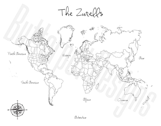 ‘The Zurells’ Bespoke Modern Style World Push Pin Travel Map